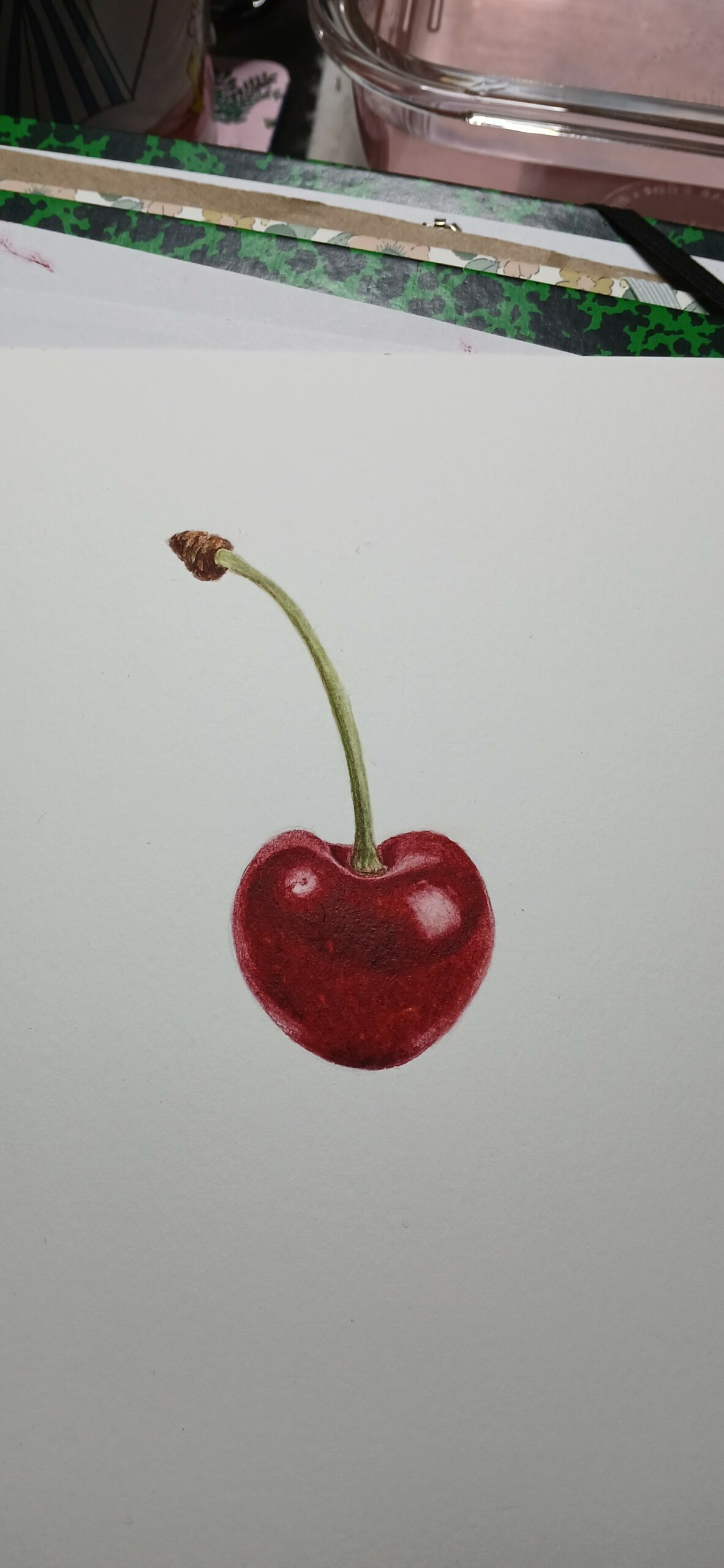 Bonjour Anne-Solange. Voici ma petite cerise. Une des difficultés que j’ai rencontré est l’effet pâteux lié à l’aquarelle sèche. J’ai du mal à doser l’eau sur la palette. Soit j’en mets trop et gloups mon pinceau boit tout et je dois pas mal l’essorer dans mon Sopalin. A ce rythme mes mélanges ne durent pas longtemps. Soit je n’en mets pas assez et j’ai une texture proche de la gouache. Bonne journée ✨️